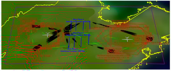 The software in this paper is primarily developed using Qt Creator 5.12.12, while the MCCFR algorithm is implemented on the Python platform and generates a “.pyd” file, which is then called by Qt. Creator. This simulation wargaming software uses the frequency usage parameters of both the red and blue sides, as shown in Table 6, as input. During the simulation process, the red-side agents intelligently select frequencies for communication using the MCCFR algorithm based on predefined trajectory and frequency usage information to avoid interference. Meanwhile, the blue side employs the MCCFR algorithm to select frequencies for interference intelligently. Figure 4 illustrates the simulation scenario constructed using the developed software. During the simulation, the red and blue opposing teams move along predefined trajectories and make frequency allocation decisions based on the MCCFR algorithm. In the figure, the black sectors represent the blue team’s jamming areas and directions, the red lines indicate disrupted communications between red team agents due to jamming, and the green lines signify successful link establishment and normal communication for the red team.