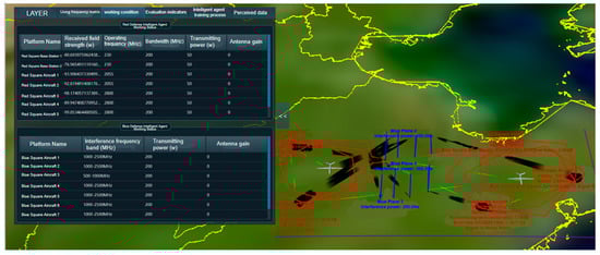 In the simulation interface, partial information is displayed below the red and blue agents, including the blue team’s jamming power and the red team’s signal-to-noise ratio (SNR), jamming-to-signal ratio (JSR), and bit error rate (BER). Additionally, detailed information about both teams’ agents is shown in the expanded panel on the left side of the interface, as illustrated in Figure 5.