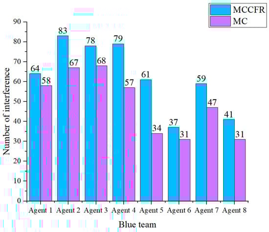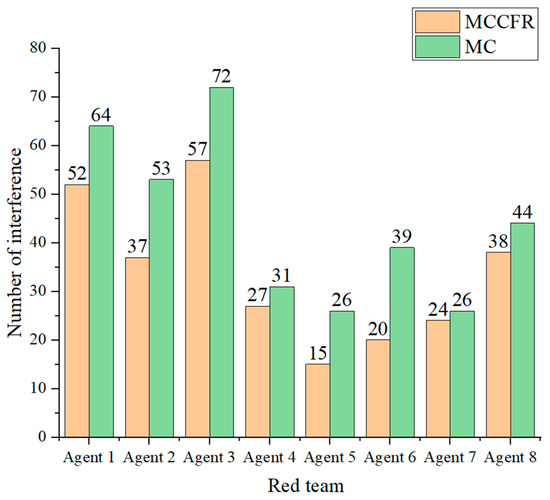 Comparison of interference counts for red team defensive agents based on the MCCFR and MC strategy.