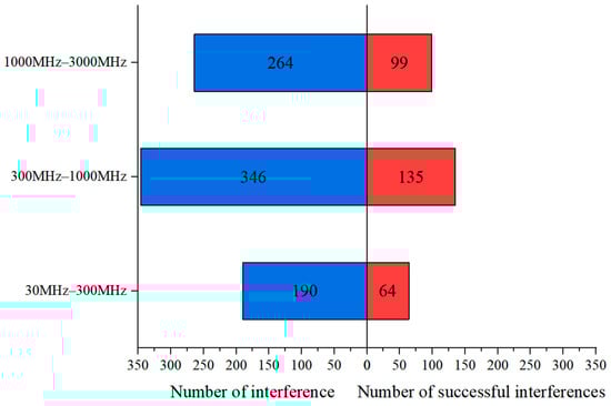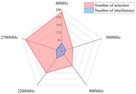 Figure 9 illustrates the number of times the blue team agent selecting specific frequency bands for interference and the number of successful interference events for those bands. It can be observed that the blue team agent most frequently selects the 300 MHz to 1000 MHz band for interference, with a total of 346 selections, accounting for 43.25% of all frequency band choices. Successful interference occurs 135 times in this band, resulting in an interference percentage of 39.02%. The next most frequently selected band is 1000 MHz to 3000 MHz, chosen 264 times, representing 33.00% of all selections. Successful interference in this band occurs 99 times, yielding an interference percentage of 37.5%. The blue team intelligent agent selects the 30 MHz to 300 MHz band for interference the least frequently, with only 190 selections, which accounts for 23.75% of all frequency band choices. Successful interference in this band occurs 64 times, resulting in an interference percentage of 33.69%. The statistical results indicate that there is a direct proportionality between the number of times the blue team intelligent agent selecting a frequency band for interference and the interference percentage, demonstrating that the MCCFR algorithm effectively optimized the choice of interference bands.