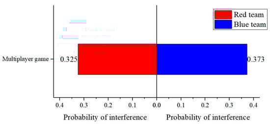 Figure 10 displays the statistics of interference and interference probability for both the red team defense and the blue team attack in a multi-player incomplete information game. It can be observed that the probability of interference experienced by the red team defensive agent is 32.5%, which is lower than the interference probability of the attacking agents at 37.3%. This discrepancy is primarily due to the overlap in frequency band selections among the eight attacking agents on the blue team, leading to two or more attacking agents interfering with the same defensive agent.