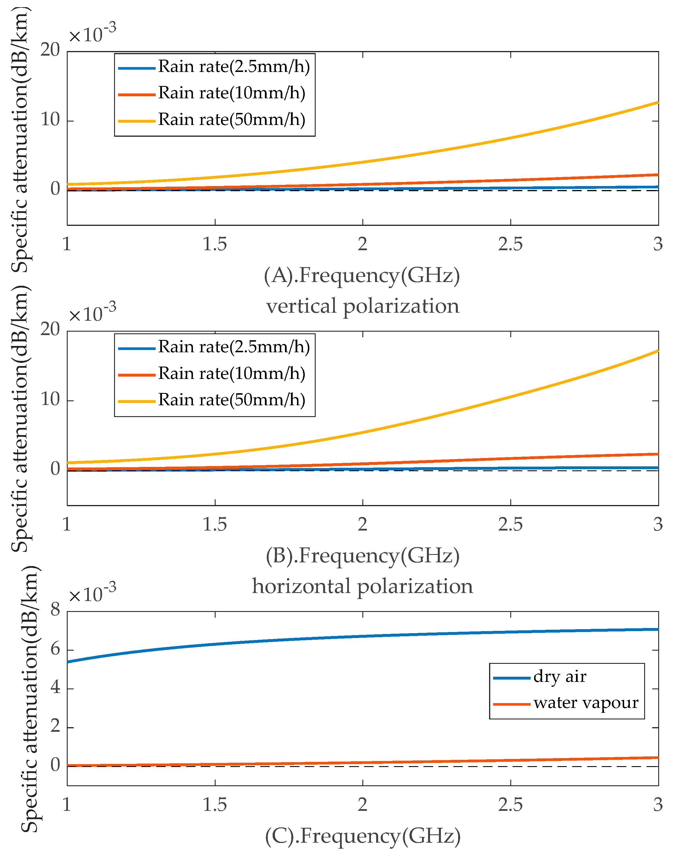 Figure 2C shows the relationship between specific attenuation and dry and water vapor at different frequencies. Dry air has a greater impact on specific attenuation than water vapor, and specific attenuation increases with frequency. At 3 GHz, the specific attenuation due to dry air reaches its maximum value of only 0.0071 dB/km. By combining Figure 2, we can observe that the impact of atmospheric gases and rainfall on propagation attenuation is minimal in the frequency range of 30 MHz to 3000 MHz. Since we are primarily focused on UAV communication with relatively short transmission distances, in order to reduce algorithm complexity, we adopt the method suggested in ITU-R P.525 Recommendation [28] to calculate L. Among them, the calculation of L in ITU-R P.525 is shown in the following formula.