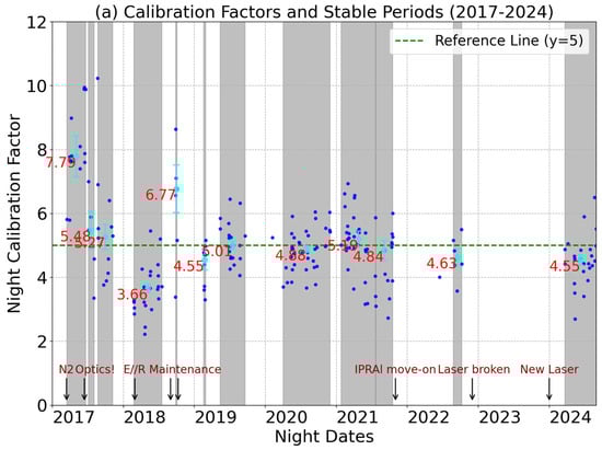 Nightly calibration coefficients (Figure 5a) and the detected instrumental shifts over March 2017–August 2024 period of IPRAL measurements are studied, thus the different stable periods are detected.