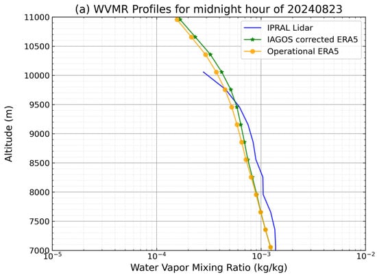 IAGOS-corrected ERA5 WVMR data set, adapted using corrected RHi [45], shows significantly better agreement with Lidar, with smaller biases and reduced variability. If we analyse two examples of Lidar WVMR midnight profiles for wet and dry conditions (Figure 12a, Figure 12b, respectively). The wet condition case (Figure 12a) exhibits a slight deviation between the original ERA5 profile and IAGOS corrected ones, by which the latter is becoming closer to the Lidar WVMR profile of the same hour, which exhibits wetter values. While the dry condition case (Figure 12b) did not involve any ERA5 correction based on ice supersaturation conditions, particularly noteworthy is the reduced bias when using the IAGOS-corrected ERA5 data set (Figure 10). This improvement validates the corrections applied to ERA5 by incorporating in situ aircraft measurements, which enhance the model’s representation of upper tropospheric humidity. Such findings demonstrated that assimilating high-resolution aircraft data significantly reduces model biases in regions critical for contrail formation and ice supersaturation. However, the remaining persistent ERA5–IAGOS corrected dry bias (Figure 10) with respect to Lidar suggests that there might be other anomalous events affecting ERA5 capacities to detect the right humidity content particularly at upper tropospheric altitudes. Here, we are reporting a possible systematic ERA5 bias linked to other conditions than ice supersaturation events.