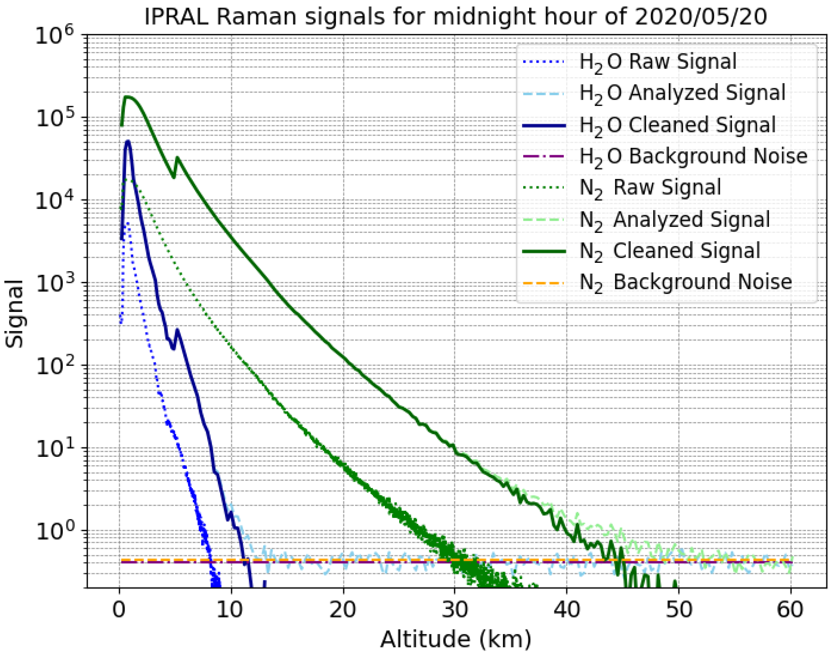 We note that water vapour Raman signals are about two orders of magnitude weaker than Nitrogen Raman signals, though the noise magnitude does not follow this same trend (Figure 2). Furthermore, the enhanced signals (resulted after reducing the vertical resolution) extend higher altitudes than raw ones. For example, the IPRAL enhanced water vapour signal can reach up to 12 km, and IPRAL enhanced Nitrogen signal can extend up to about 45 km (Figure 2).