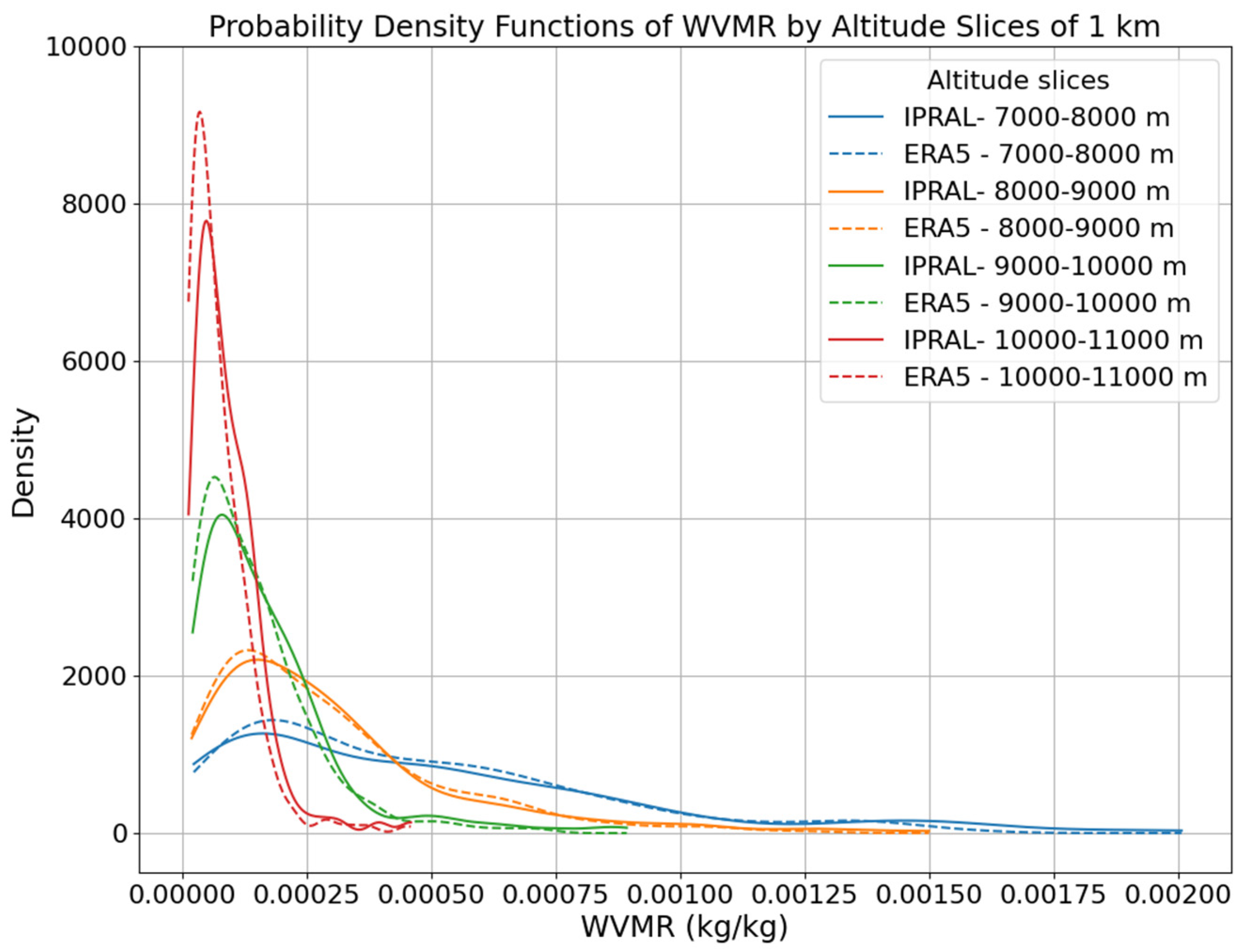 In general, IPRAL derived WVMR shows higher humidity content than the other compared data sets. This may reflect the Lidar sensitivity to detecting low water vapour concentrations. This capability is crucial for studying contrail formation mechanisms and complements the radiosonde and ERA5 data sets, which often underestimate humidity content at these altitudes.