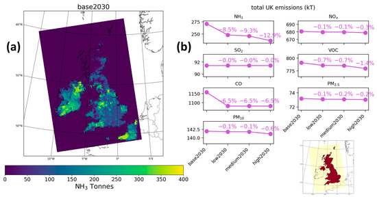 The spatial distribution of the annual NH3 emissions in tonnes for the base2030 scenario at a 10 km × 10 km horizontal resolution (a). Total UK anthropogenic emissions in kT for NH3, NOx, SO2, VOC, CO, PM2.5, and PM10 used for the different scenarios. The relative differences in these total emissions for the low2030, medium2030, and high2030 scenarios compared to base2030 are given above each point. The relative difference is calculated as follows: ((scenario-base)/base) × 100%. The geographical extent of the UK is shown in red on the layered map at the bottom (b).