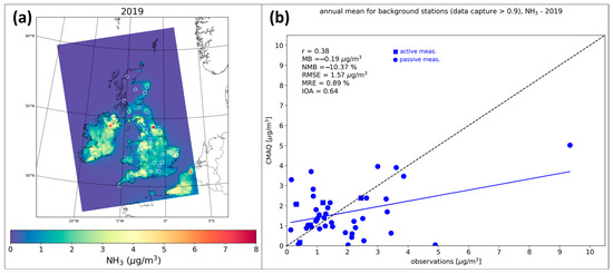 (a) The spatial distribution of annual mean NH3 concentrations in µg/m3 calculated by CMAQ at a 10 km × 10 km horizontal resolution in 2019. The measured concentrations are shown by the coloured circles (a). Comparison between these annual measured concentrations with the modelled values in 2019. Only the background stations with a data capture higher than 0.9 are used. Insert values are the Pearson correlation coefficient (R), the mean bias (MB), the normalized mean bias (NMB), the mean relative error (MRE), the root mean square error (RMSE), and the index of agreement (IOA). The blue line represents the linear fit and the dashed black line is the 1:1 slope (b).