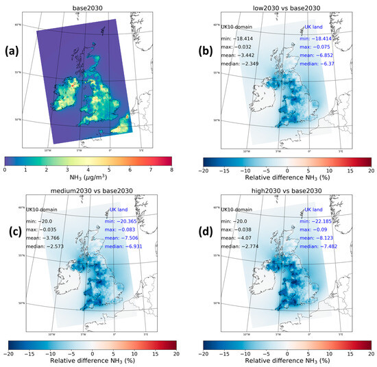 The spatial distribution of annual mean NH3 concentrations in µg/m3 calculated by CMAQ at a 10 km × 10 km horizontal resolution for the base2030 scenario (a). The relative differences in the same distribution with the low2030 (b), medium2030 (c), and high2030 (d) scenarios. The minimum, maximum, mean, and median relative difference values in the whole UK10 domain (in black) and for the UK land grid cells (blue) are provided. The relative difference is calculated as follows: ((scenario-base)/base) × 100%.