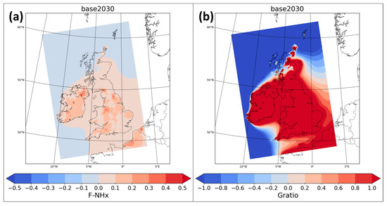 The 10 × 10 km gridded NH3 emissions for base2030 used in CMAQ are shown in Figure 2a. The NH3 area sources are well highlighted by the map in Figure 2a. These source regions are mainly located in Northern Ireland, Staffordshire–West Midlands, Suffolk, Cornwall, and Devon to cite a few in the UK.