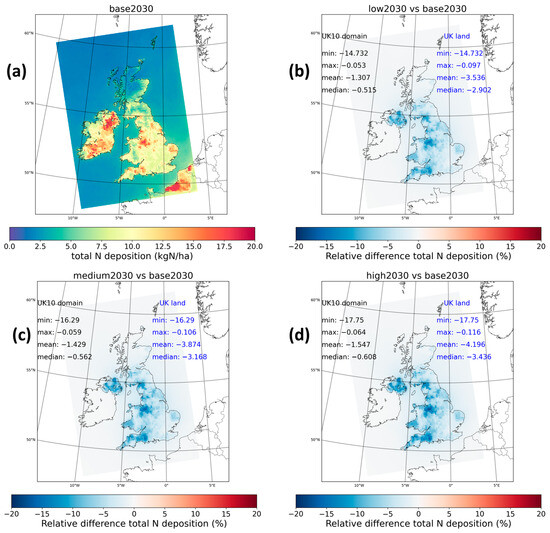The spatial distribution of total N deposition in kgN/ha calculated by CMAQ at a 10 km × 10 km horizontal resolution for the base2030 scenario (a). The relative differences in the same distribution with the low2030 (b), medium2030 (c), and high2030 (d) scenarios. The minimum, maximum, mean, and median relative difference values in the whole UK10 domain (black) and for the UK land grid cells (blue) are provided. The relative difference is calculated as follows: ((scenario-base)/base) × 100%.