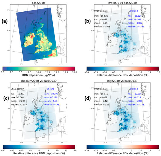 The spatial distribution of total RDN deposition in kgN/ha calculated by CMAQ at a 10 km × 10 km horizontal resolution for the base2030 scenario (a). The relative differences in the same distribution with the low2030 (b), medium2030 (c) and high2030 (d) scenarios. The minimum, maximum, mean, and median relative difference values in the whole UK10 domain (black) and for the UK land grid cells (blue) are provided. The relative difference is calculated as follows: ((scenario-base)/base) × 100%.