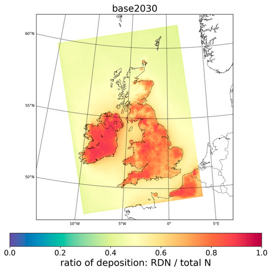 The spatial distribution of the ratio of the reduced N deposition (RDN) relative to the total N (reduced plus oxidised N) deposition calculated by CMAQ at a 10 km × 10 km horizontal resolution for the base2030 scenario.