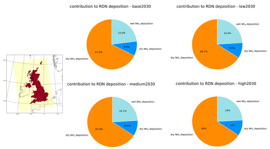The contribution to RDN deposition in percentage terms for the 4 scenarios (base2030, low2030, mdeium2030, and high2030) in the UK. The UK grid cells used for the calculation are highlighted in red on the layered map.