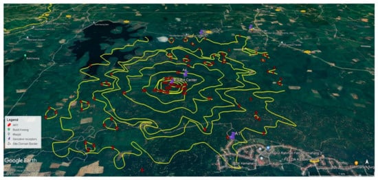 With a quarrying and crushing rate of 40,000 tons per month using primary, secondary, and tertiary crushers and with dust control measures strictly implemented to reduce dust particles as mentioned above, the forecasted maximum 24 h average PM10 incremental concentration at the receptor grid area was between a low of 2.00 µg/m3 about 3 km away and the highest incremental concentration of 80 µg/m3 at the project site boundary. Figure 1 shows the forecasted maximum 24 h average PM10 incremental concentration contours in study site #1. The existing baseline PM10 concentrations are 59.00 µg/m3, 50.00 µg/m3, 51.00 µg/m3, and the incremental concentrations are 57.68 µg/m3, 4.75 µg/m3,, and 2.12 µg/m3 at monitoring sites A1, A2, and A3, respectively. The ambient PM10 concentration combines the baseline concentration and the highest incremental concentration, measuring 116.68 µg/m3, 54.75 µg/m3, and 53.12 µg/m3, respectively. Therefore, the 24 h mean PM10 concentration is 74.85 µg/m3, which remained under the new MAAQG threshold limit of 100.00 µg/m3.