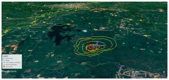 This study assessed the effects of background air quality, demonstrating compliance with background air quality standards. Under the US EPA Guideline on Air Quality Models (GAQM), this work adopts the AERMOD model [28]. The dispersion modeling was performed using Version 21112, December 2021, and one year of hourly meteorological data was generated using the MM5 (Fifth-Generation Penn State/NCAR Mesoscale Model). A one-year data set was processed using AERMET, the meteorological processor for AERMOD, and it complied with the revised guideline of the AERMOD model released by the US EPA.