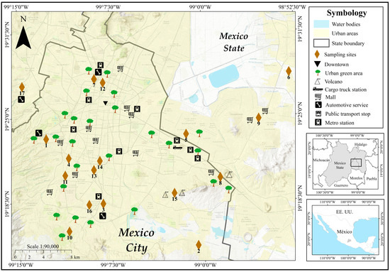 - Aguilera, A.; Morales, J.J.; Goguitchaichvili, A.; García-Oliva, F.; Armendariz-Arnez, C.; Quintana, P.; Bautista, F. Spatial distribution of magnetic material in urban road dust classified by land use and type of road in San Luis Potosí, Mexico. Air Qual. Atmos. Health 2020, 13, 951–963. [Google Scholar] [CrossRef]