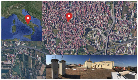The data for this study were collected within the MonAir Project, which focused on characterizing particulate matter in the urban environment of Pomigliano D’Arco, a highly urbanized and industrialized municipality east of Naples, Southern Italy (see Figure 1). Sampling and measurements were conducted on the rooftop of the City Hall building. Each sampling session lasted 24 h, with a daily air volume of 54.7 m3. Measurements spanned from January 2018 to December 2023. 24 h PM10 concentration determinations (midnight to midnight) were performed using a low-volume gravimetric sampler equipped with a 10 μm cut-off inlet. The instrument, a dual-channel beta attenuation monitor (SWAM5a Dual Channel Monitor, FAI Instruments, Fonte Nuova, Italy), operated at a flow rate of 2.3 m3/h. A 47 mm diameter quartz microfiber filter was used for collection. The instrument is TÜV- and CERT-certified as a beta monitor and complies with EU equivalence criteria for PM measurements, following EN 12341 and EN 14907 reference methods [22].