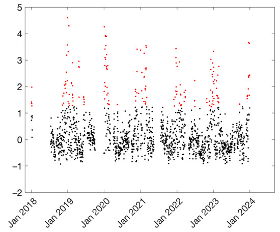 Normalized time series at the PdA site. Anomalies (values exceeding the median by more than 1.5 times the interquartile range) are indicated in red.