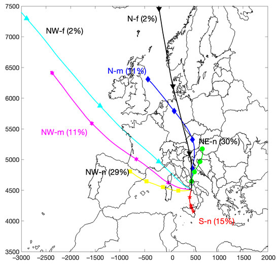 Trajectory means of airflow patterns arriving at PdA during the period 2018–2023. The percentages represent the frequency of occurrence for each cluster. Symbols corresponding to each trajectory are displayed at intervals of 12 h.