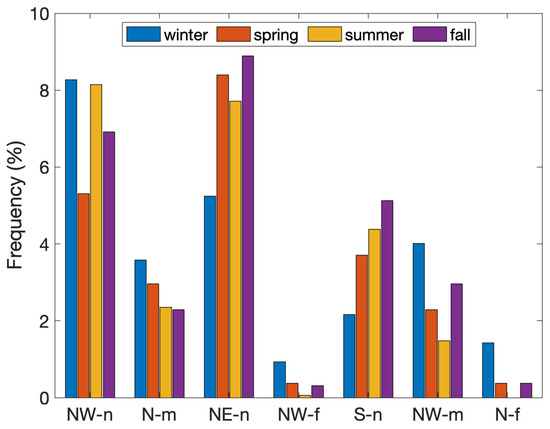 Figure 6 also displays the frequencies of occurrence for each cluster. The most frequent occurrences were for the NW-n and NE-n clusters, with frequencies of 29% and 30%, respectively. Infrequently, trajectories originated from the N-f and NW-f clusters, whereas the NW-m and N-m clusters showed intermediate frequencies of occurrence.