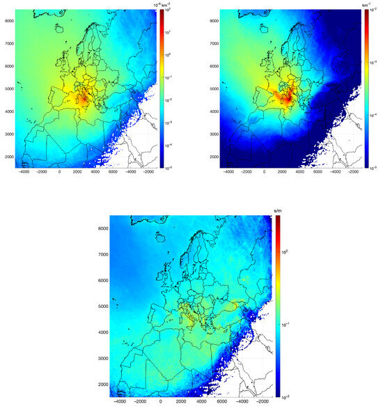 Figure 8 represents the pdf for RT on a logarithmic color scale for the whole set of trajectories. As depicted, the predominant directions of arrival were from the northeasterly and westerly directions, corroborating the findings already found from cluster means in Figure 6, which reflected a similar pattern. This is consistent with a predominant influence at PdA of air masses originating from the northeastern part of Europe and from the western Mediterranean basin, usually associated with localized atmospheric circulation, including cyclonic or anti-cyclonic patterns and low wind conditions. The sharp gradient in residence times observed along geographical boundaries, such as the Alpine region, indicates the role of topography in modulating air mass transport pathways, potentially acting as a barrier to long-range advection, with little to no transport through this boundary. The impact of local topographical features is also evident. Figure 8 (upper-left panel) shows that the air masses that approach Naples mostly come from the eastern sector. This causes the channeling of sea/land breezes into the plain between the hills on the shoulders of the city and Mount Vesuvius. Lower residence times in areas such as northern Europe and southeastern regions of the Mediterranean basin contributed less frequently to the air composition at the receptor site during the analyzed period. The southeastern regions of the Mediterranean basin often exhibit nonsignificant values. Furthermore, the distribution underscores the influence of the central Mediterranean as a source or reservoir of atmospheric pollutants, with implications for air quality at this receptor site. High RT values in this region, due to the prevalence of nearby circulation patterns, point to stagnation events that enhance pollutant accumulation or recirculation.