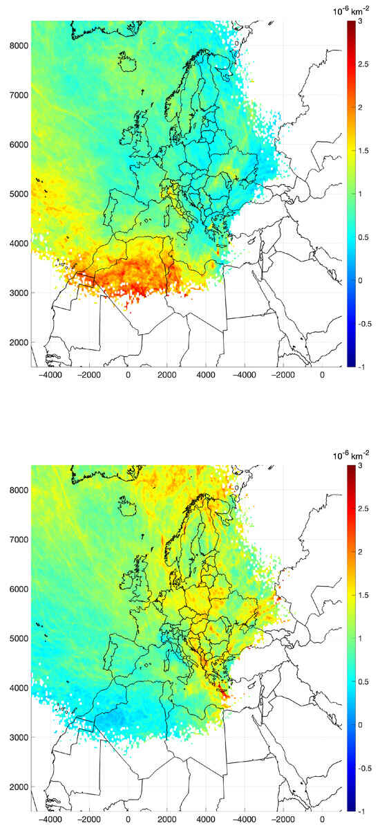 The spatial patterns in the RT and transport directional frequency were quite similar (Figure 8). Therefore, the RT was predominantly due to the frequency at which trajectories traverse a given area prior to reaching the receptor. The distribution of accumulation potential exhibits considerable heterogeneity, with the most elevated values located within a band across the Italian peninsula, ranging from over 0.1 to 0.5 s/m, corresponding to effective air mass transport velocities of approximately 2 to 10 m/s. Notably, accumulation potentials were also observed over the Balkan region and the northern sector of the Saharan desert in areas identified by [39] as source regions in northern Africa.