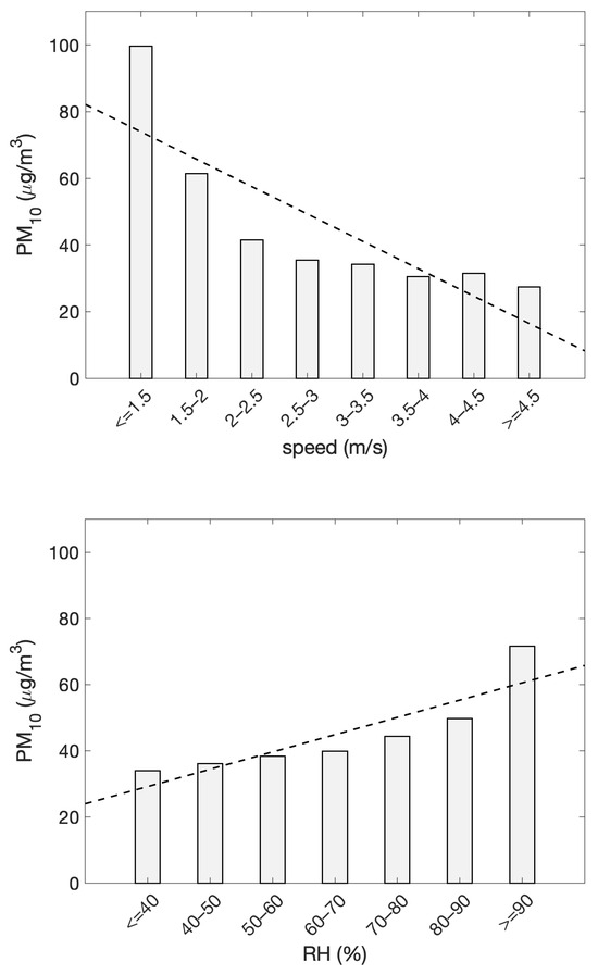 PM10 concentrations vs. wind speed (upper panel) and relative humidity (lower panel). The dashed lines represent the linear best fit, highlighting the trend line of particulate matter vs. wind and relative humidity ranks.