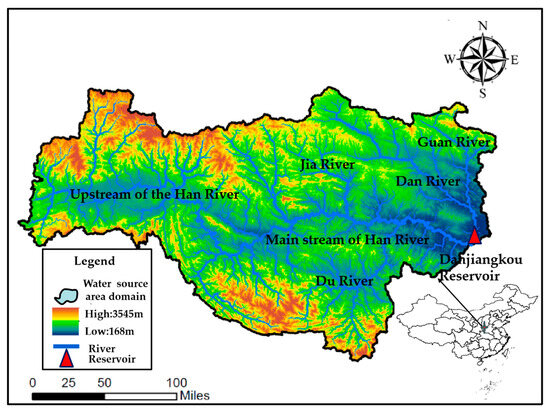 The range of the Danjiangkou reservoir basin is 31°0′–35°0′ N,106°0′–112°0′ E, and it spans six provincial administrative regions: Shanxi, Gansu, Henan, Hubei, Chongqing, and Sichuan [17]. The overall topography of the source area is characterized by being higher in the west and lower in the east. Climatically, the northern part of the basin has a warm temperate semi-humid climate, while the southern part has a subtropical humid climate. The temperature is −13.2–42.6 °C, the average annual temperature is 14.5 °C [18]. The water source area is rich in water resources, with an average annual runoff of 36.9 billion m3. The runoff during the wet season accounts for 77.80% of the annual runoff. The annual average precipitation is 750–850 mm, and the annual average wind speed is between 1.0–2.5 m/s. The Danjiangkou Reservoir provides a stable and reliable water resource guarantee for the middle route of the South-to-North Water Diversion Project [19]. The digital elevation map of the study area is shown in Figure 1.