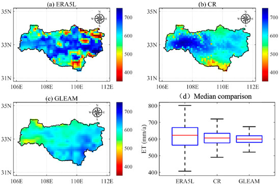 It can be seen from Figure 2 that the spatial distribution of evapotranspiration in the Danjiangkou Reservoir Basin from 1982 to 2017 is relatively obvious. For example, the evapotranspiration in the eastern and central parts of the basin is larger in ERA5Land, and the evapotranspiration in northeastern and southern parts is smaller. The multi-year average evapotranspiration for the whole basin is 605 mm/a. The evapotranspiration the western part of the basin is larger in CR, and the evapotranspiration in the southern part is smaller. The multi-year average evapotranspiration for the whole basin is 604 mm/a. The evapotranspiration in the southeastern part is larger in GLEAM, and the evapotranspiration the northwestern part is smaller. The multi-year average evapotranspiration for the whole basin is 598 mm/a. This difference may stem from the model algorithm using different data. Moreover, the spatial difference of evapotranspiration also reflects the complexity and heterogeneity of the underlying surface in the Danjiangkou Reservoir Basin. Although the spatial variability of the three sets of evapotranspiration data is large, the box plot in Figure 2d shows that the medians of the evapotranspiration amounts of the three are relatively close. Overall, ERA5Land has the largest range of values, with the most pronounced difference between its maximum and minimum values, while the GLEAM data is more consistent.