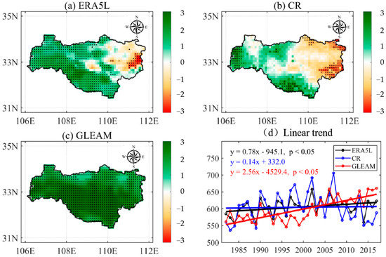 From Figure 3, it can be seen that overall, the three ET datasets all show an increasing trend, but there are some differences in their spatial distribution change rate. Among them, ERA5Land and CR data show significantly decreased trends in the eastern part of the basin and significantly increased trends in the northwest and southwest; GLEAM, on the other hand, showed a significant increase throughout the basin. Through linear trend analysis, it can be seen that the increasing trend of GLEAM evapotranspiration is the most obvious, with a growth rate of 2.56 mm/a, and it has passed the significance test at the 95% level. CR evapotranspiration has the weakest increasing trend, with growth rate of 0.14 mm/a, but it is not significant.