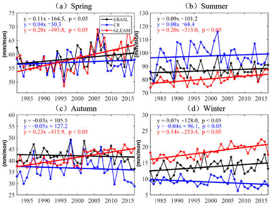 It can be seen from Figure 4 that the three sets of evapotranspiration data show different change trends in the four seasons of the year. In spring, the three datasets all showed an increasing trend, and the ERA5Land and GLEAM evapotranspiration data showed a significant increasing trend, with a growth rate of 0.11 mm/a and 0.28 mm/a, respectively. Similar to spring, summer evapotranspiration data from the three datasets showed an increasing trend, but its growth rate was less than that in spring. For autumn and winter, the three datasets show a divergence. In autumn, ERA5Land and CR data showed an insignificant decreasing trend, while the GLEAM dataset still maintained an increasing trend. For winter, the performance of the three datasets was more distinct, with ERA5Land and GLEAM data showing a significant increasing trend, but with a large difference in the growth rate for the CR data. On the other hand, CR data showed a significant decreasing trend. Overall, the three sets of data show a high degree of consistency in summer and a greater degree of variability in winter.