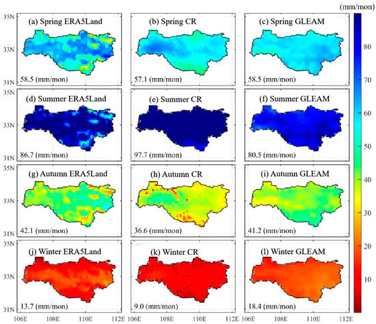 Spatial distribution of evapotranspiration across four seasons in the Danjiangkou Reservoir Basin from 1982 to 2017. Note: The four lines from top to bottom represent the four seasons of spring, summer, autumn, and winter, and the three columns from left to right represent ERA5Land, CR, and GLEAM.