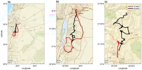 Driving tracks for the mobile measurements made on 12 and 28 April projected on (a) map of Jordan, (b) zoomed for the northern–western region of Jordan, and (c) zoomed for the Karak governorate.