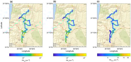 Spatial variation in the particulate number concentrations within the Karak governorate: (a) PN10, (b) PN1, and (c) PN10–1.
