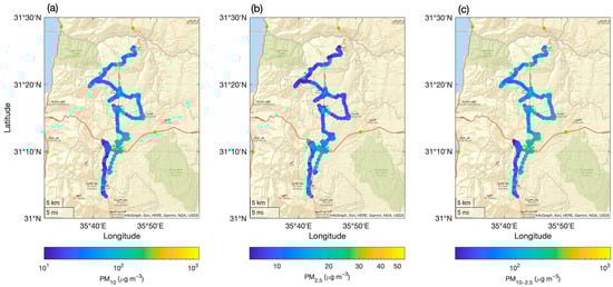 Spatial variation in the particulate mass concentrations within the Karak governorate: (a) PM10, (b) PM2.5, and (c) PM10–2.5.