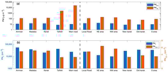 Average concentrations separated for different cities, roads, and parts within the Karak governorate. (a) Particle mass (PM2.5 and PM10) and (b) submicron particles (PN1) and coarse particles (PN10–1).