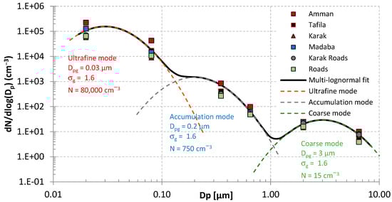 Particle number size distribution was fit by assuming three main modes: an ultrafine mode, an accumulation mode, and a coarse mode [54].