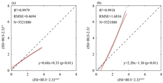 Scatterplot of a power function with (ISI + BUI − 2.3)x (power exponent of 0.5 (a) and 1 (b)) as base (N is sample number; the red lines represent the trend).