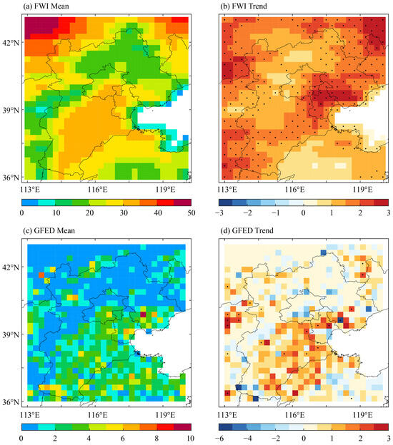 Spatial patterns of the multi-year means ((a,c), units: days) and trends ((b), units: 10 a−1; (d), units: days 10 a−1) of the April–May fire weather index-based (a,b) and GFED-based wildfire days (c,d) in the BTH region.