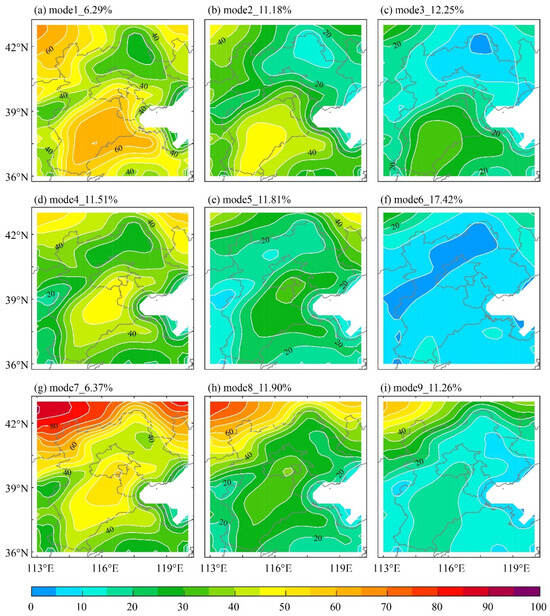 Nine mode patterns (a–i) derived from SOM analysis of FWI composites in the BTH region from 1981–2020 (the upper left corner value of each SOM mode indicates the percentage of occurrence of that pattern).