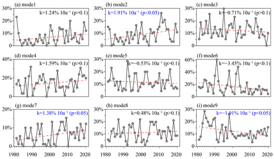 Temporal variations in the frequency of nine SOM modes (a–i) over the past 40 years (the red dotted lines show the trend in the frequency of the SOM modes; k is the frequency variability per 10 years in each subplot; the blue values denote significance at a confidence level of 0.05).