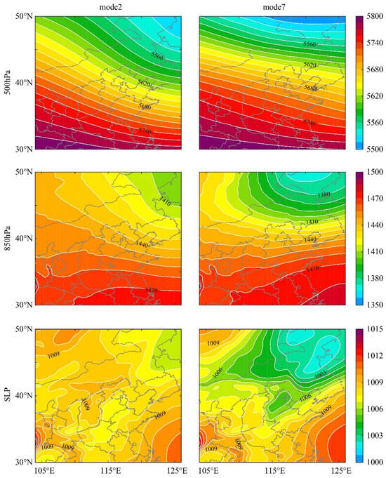 Spatial pattern of the geopotential height at pressure levels of 500 hPa (upper; units: m) and 850 hPa (middle; units: m) and sea-level pressure (bottom; units: hPa) composites in SOM modes 2 (left) and mode 7 (right).