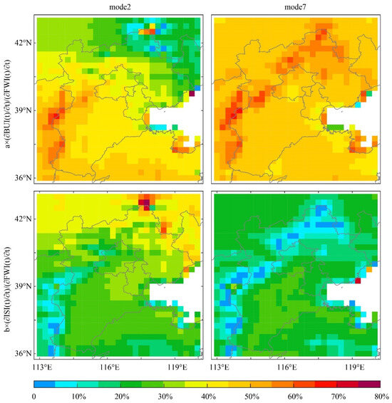 The abovementioned findings suggest that, in mode 2, the fuel availability index is the dominant factor driving FWI variations in the central and southern regions, while the wildfire spread rate index predominates in the northeastern region. The FWI variations in the BTH region under mode 7 are influenced mainly by the fuel available index. These observations align with the spatial pattern of atmospheric circulation shown in Figure 6, which demonstrates that atmospheric circulation patterns influence local wildfire danger by modifying the fuel availability index and wildfire spread rate index in different modes, respectively. It is important to note that the sum of the contributions from the variations in the fuel available index and the wildfire spread rate index does not total 100%. There are two aspects. On the one hand, we implement an approximate transformation when calculating the partial differential equations, as shown in Figure 2. On the other hand, the derived partial differential equation contains a residual term, which, although negligible, could still affect the results.