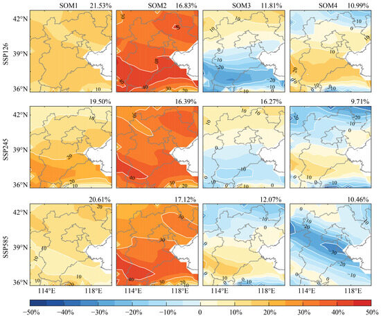 The composites of FWI anomalies percentage for the top four mode patterns derived from SOM analysis in the BTH region from 2021–2100 under the SSP126 (top), SSP245 (middle), and SSP585 scenarios (bottom) (the reference period is from 1981 to 2020; the upper right corner value of each SOM mode indicates the percentage of occurrence of that pattern).