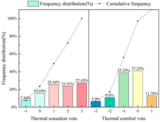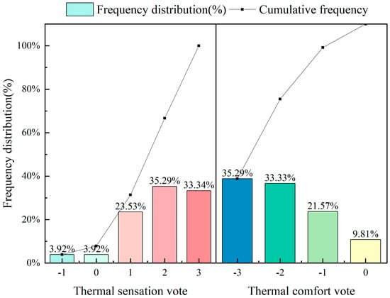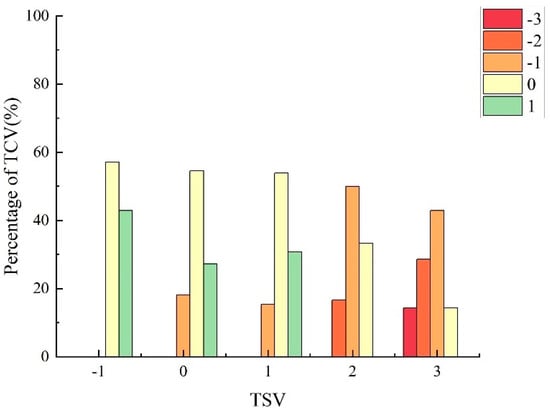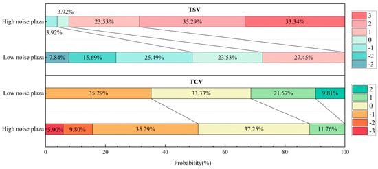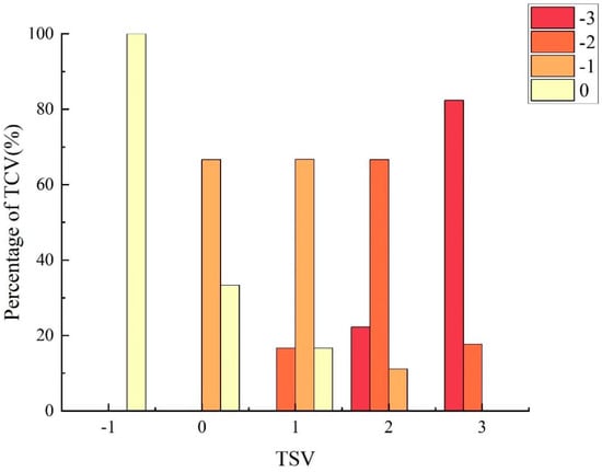 - TCV for HP ranged from −3 to 0, with the bulk, 90%, concentrated at a TCV of −2, of which 35.29% accounted for a TCV of −3. In contrast, the TCV distribution for LP spanned from −3 to 1, predominantly at 0, representing 37.25% of the votes. Unlike HP, LP conditions were perceived as slightly comfortable by 11.76% of participants, underscoring that high-decibel noise exacerbates thermal discomfort perceptions.