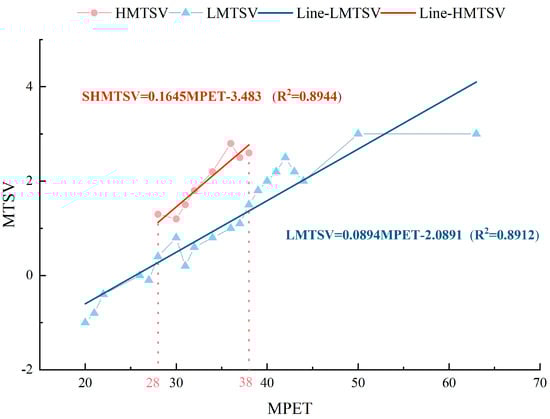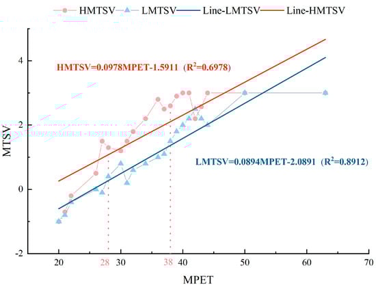- Investigating the effects of acoustic environments on thermal comfort, it was determined that the MPET associated with high noise levels spans from 28 °C to 38 °C. The NPET in such conditions is calculated to be 21.2 °C, with an NPETR defined between 18.1 °C and 24.2 °C. Conversely, under low-noise conditions, the NPET adjusts to 23.4 °C, with the corresponding NPETR broadening from 17.8 °C to 29.0 °C. These findings underscore the influence of high-decibel noise in heightening the perception of heat, though this effect notably diminishes outside the specified temperature range, indicating a lessened impact of noise on thermal sensations at extreme temperatures.
