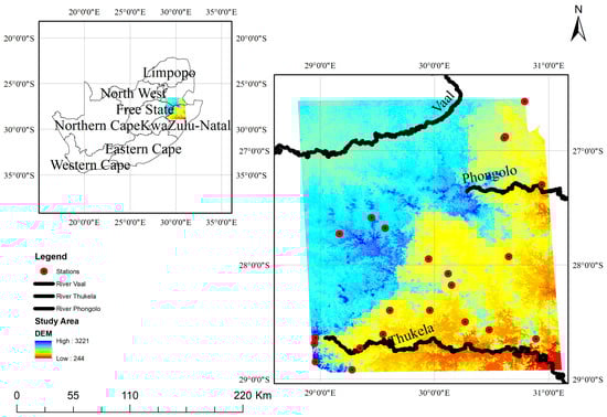 Across the African continent, rainfed agriculture is vulnerable to climate change impacts, especially in the context of a lack of adaptation capacity in water-stressed regions [16,17,18]. This also holds true for the Enkangala Escarpment. Consequently, this study aims to identify the potential presence of long-term rainfall trends over the Enkangala Escarpment of South Africa, an important water catchment for agriculture, livestock production, forestry, hydropower, and the mining sector. It complements earlier studies focused on regional, country, and provincial-wide rainfall trends [19,20,21]. The outcome of this research is intended to inform the decision-makers of the identified trends and to guide policy on climate change adaptation.