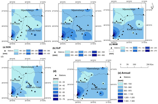 The spatial distribution of seasonal and annual rainfall over the study period is presented in Figure 3a–e. The onset of rainfall occurs in September, with SON totals peaking over the eastern domain and with a clear west–east gradient in rainfall (Figure 3a). Rainfall totals range between 180 and 220 mm in the west during spring, but with higher totals in the east and southwest. During DJF, general summer rainfall occurs over the Enkangala Escarpment, and the spatial distribution is more uniform compared to other seasons (Figure 3b). Most stations report between 350 and 400 mm of rain, with only the southern parts and far northeastern part of the domain receiving higher average summer rainfall. For MAM, rainfall varies between 110 and 160 mm over most of the domain, less than half of the DJF totals (Figure 3c). The effects of the escarpment can be clearly seen, with rainfall totals being higher east of the escarpment than over the plateau to the west. MAM rainfall peaks in the southwest, along the escarpment. JJA is the dry season, with most of the Enkangala Escarpment receiving less than 45 mm of rain during these months (Figure 3d). It is only along the escarpment in the southwest where higher totals are recorded in winter.
