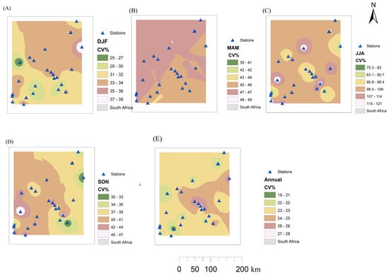 The spatial distribution of the coefficient of variation (CV%) over the Enkangala Escarpment for the period of 1972–2022. Seasonal: DJF (A), MAM (B), JJA (C), SON (D), and annual (E).